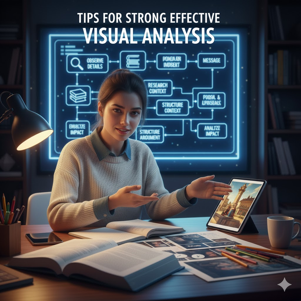 A compelling visual analysis goes beyond simple observation—it demonstrates insight, clarity, and strong critical thinking. Use the following tips to strengthen your analysis and elevate your writing: